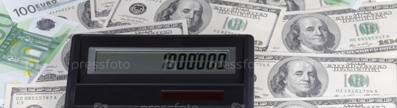 Доллар, банкнота евро и калькулятор