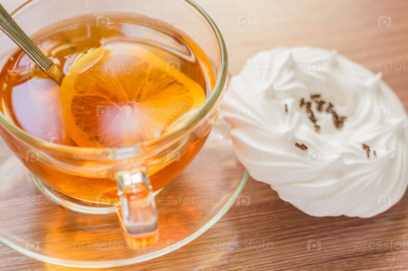 Черный чай в прозрачной чашке с воздушными домашними безе крупным планом