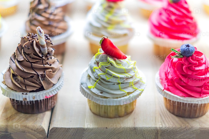 Витрина кондитерской с разнообразными кексами, выборочный фокус