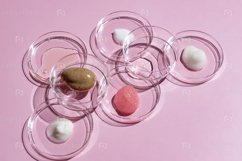 Чашки Петри с косметическими пятнами и каплями. Концепция лабораторных испытаний и исследований. Прозрачная химическая посуда на светло-розовом фоне