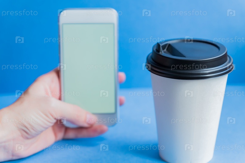 Рука левой женщины держит белый смартфон и одноразовую чашку из белой крафт-бумаги для кофе с черной пластиковой крышкой на синем фоне