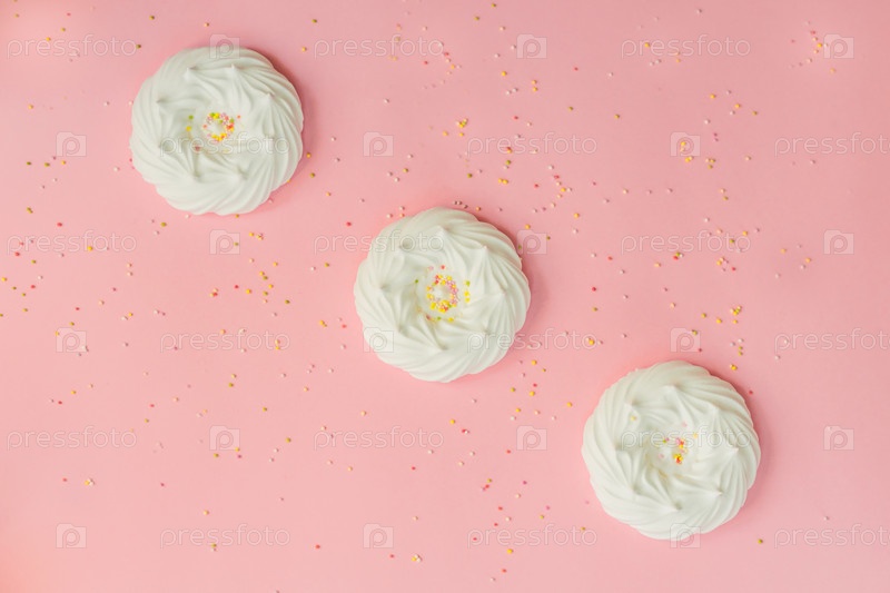 Вид сверху на домашние белые воздушные безе и кондитерские украшения на розовом фоне