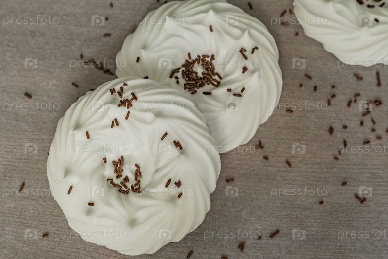 Вид сверху на домашние белые воздушные безе и кондитерские украшения на пергаментной бумаге