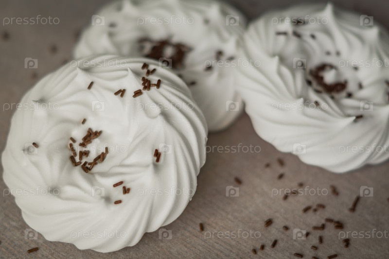 Домашние белые воздушные безе и шоколадные кондитерские украшения на пергаментной бумаге