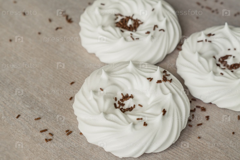 Домашние белые воздушные безе и шоколадные кондитерские украшения на пергаментной бумаге