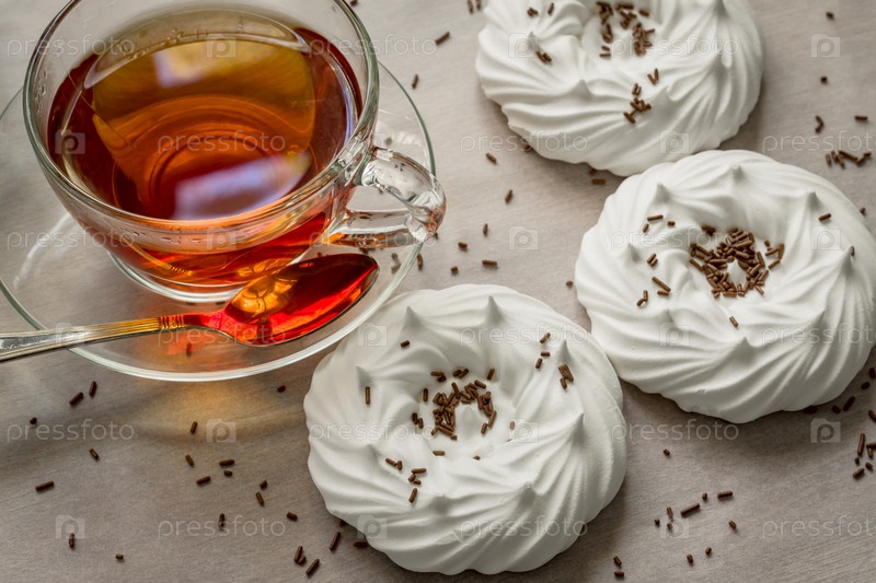 Черный чай в прозрачной чашке с воздушными домашними безе крупным планом