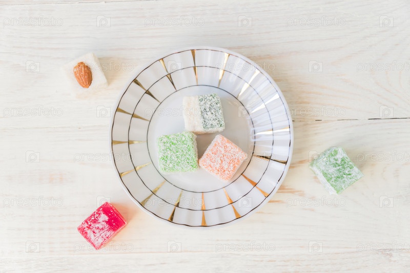 Традиционный рахат-лукум на тарелке на белом деревянном фоне. Ассорти восточных сладостей. Вид сверху