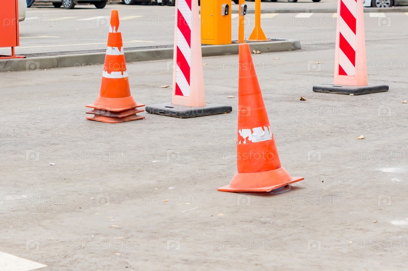 Дорожные конусы посреди улицы. знаки безопасности дорожного движения и дорожных работ