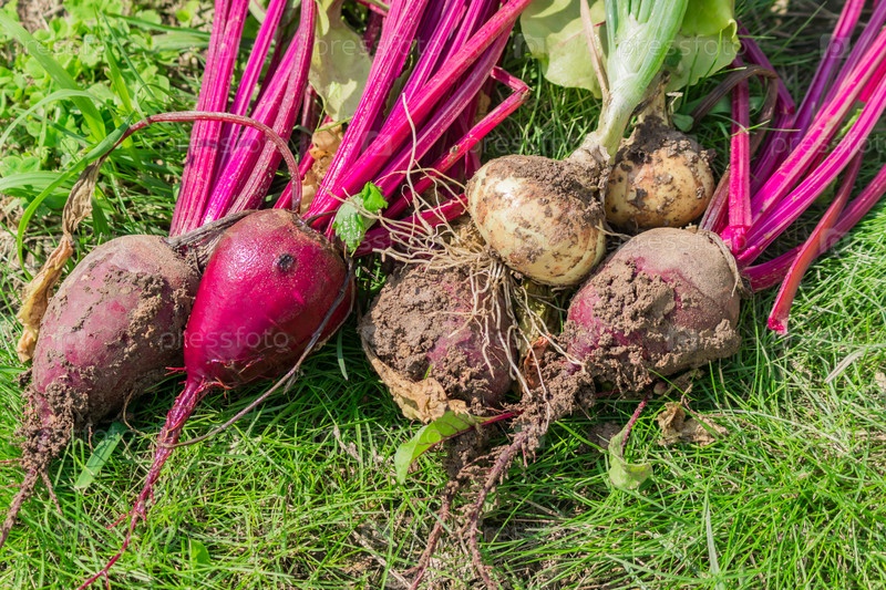 Свежий урожай свеклы и лука на земле. Чистые и грязные клубни овощей