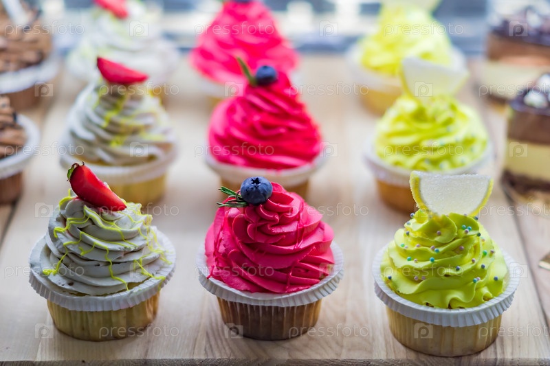 Витрина кондитерской с разнообразными кексами, выборочный фокус