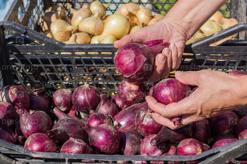 Новый урожай лука в пластиковых ящиках. Женская рука чистит спелый красный лук