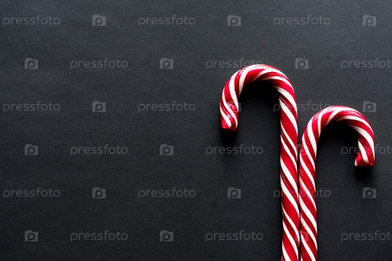 Поздравительная открытка с Новым годом и Рождеством. Две леденцы на черном фоне с копией пространства для текста