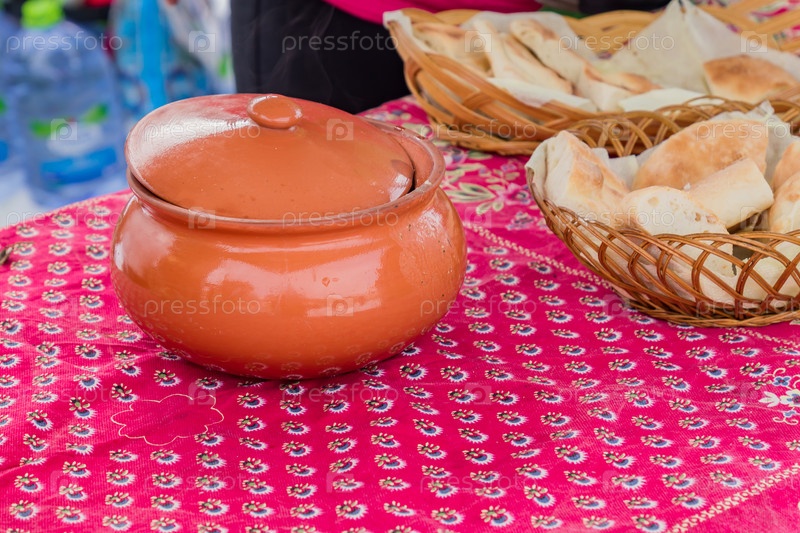Крупный план глиняной миски и корзины с питой на столе, на открытом воздухе