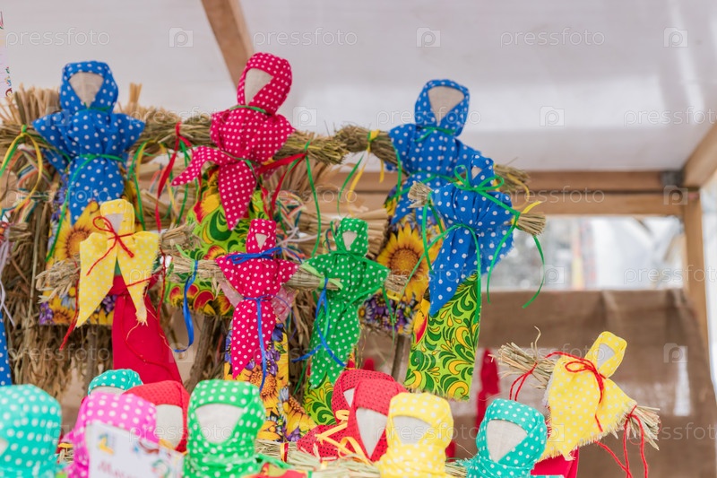 Маленькие масленичные куклы на уличной ярмарке - чучело для сжигания как символ прихода весны