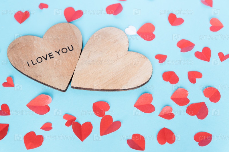 Концепция дня святого валентина и праздников - два деревянных сердца, вырезанные из бумаги маленькие сердечки на синем фоне. Украшение ручной работы