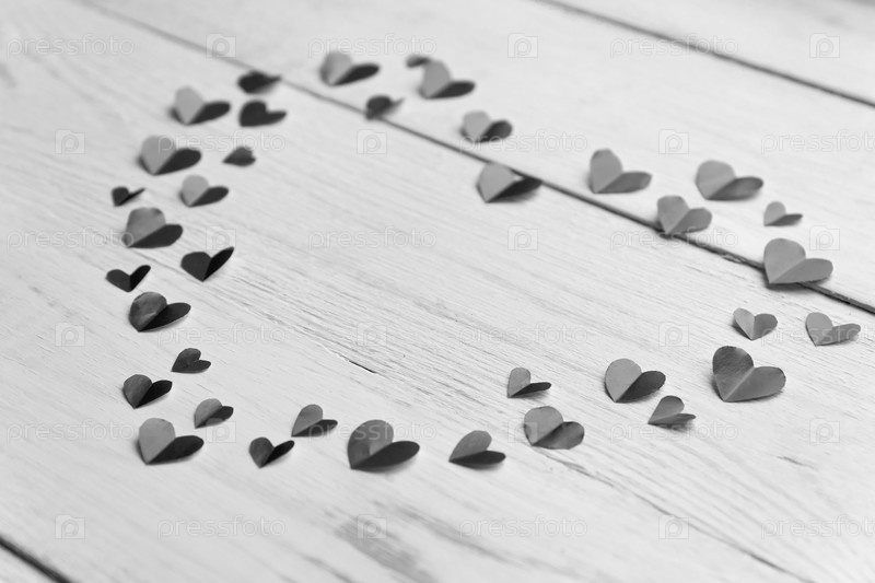 Большое сердце из вырезанных бумажных маленьких сердечек на деревянном фоне. Украшение ручной работы на день святого Валентина. Черное и белое