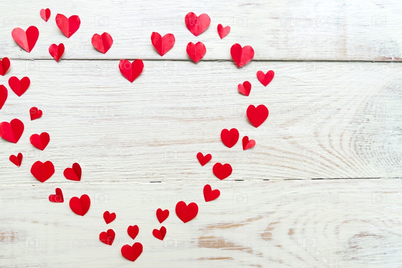Большое красное сердце из вырезанных бумажных маленьких сердечек на деревянном фоне. Украшение ручной работы на день святого Валентина
