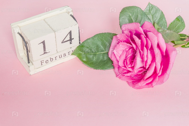 Концепция дня святого валентина и праздников - крупный план деревянного календаря с датой 14 февраля и розовой розой на розовом фоне