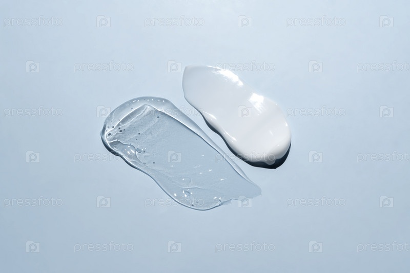 Мазки образцов двойной текстуры геля и крема на синем фоне, прозрачная сыворотка с муцином улитки, средство по уходу за кожей, плоский слой, крем с гиалуроновой кислотой