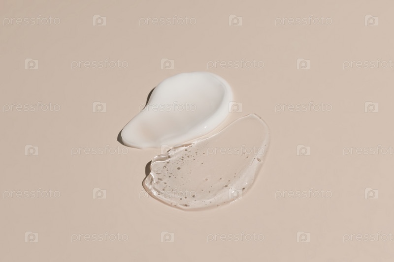 Гель и крем с двойной текстурой, мазок на бежевом фоне, прозрачная сыворотка с муцином улитки, средство для ухода за кожей, плоский слой, крем с гиалуроновой кислотой
