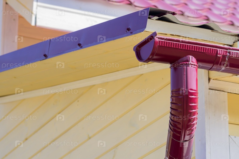 Крупный план красного водостока на крыше дома