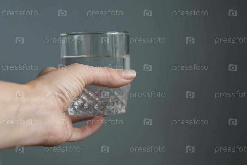 Женщина держит в руке стакан воды на сером фоне