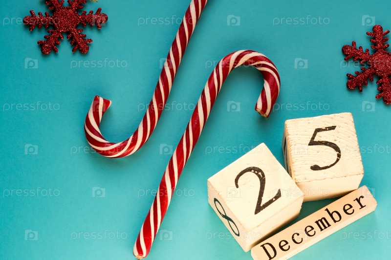Календарь из деревянных блоков, показывающий 25 декабря. Праздник Рождества. Открытка с леденцами и сверкающими снежинками