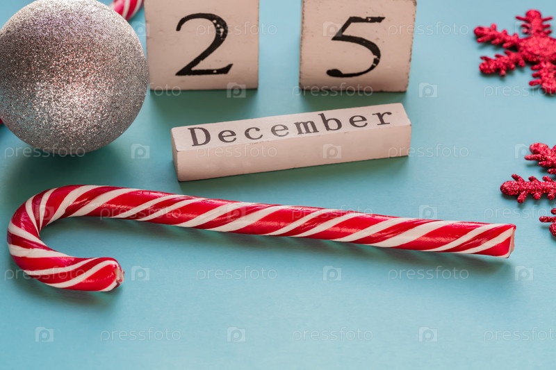 Календарь из деревянных блоков, показывающий 25 декабря. Праздник Рождества. Открытка с леденцами и сверкающими снежинками