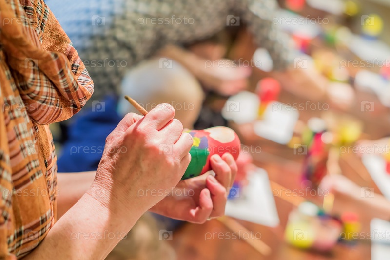 Женщина-аэртист украшает деревянную кукольную игрушку (матрешку) в мастерской