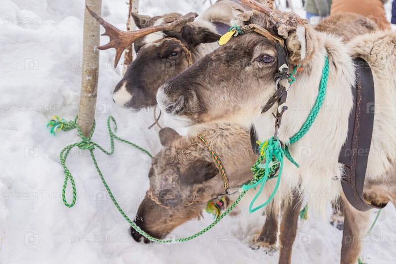 Три оленя катаются на упряжках в зимнем лесу