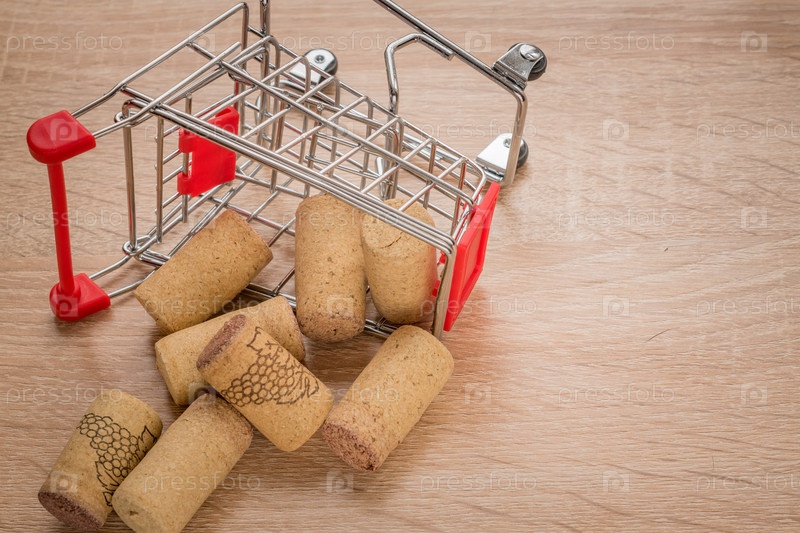 Упавшая корзина, полная использованных пробок от виноградной лозы, концепция на деревянном фоне