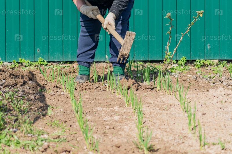 Женщина удаляет сорняки со своих зеленых грядок с помощью мотыги. концепция агрономии