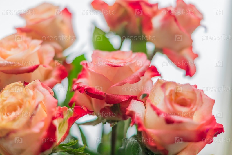 Красивый букет розовых роз с каплями воды на светлом фоне