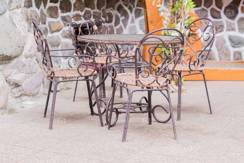 Пустое уличное кафе со столом и стульями в Москве, Россия