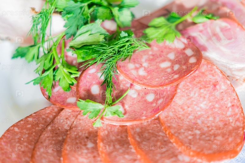 Салями из копченой колбасы, нарезанная на тарелку дрелью и петрушкой