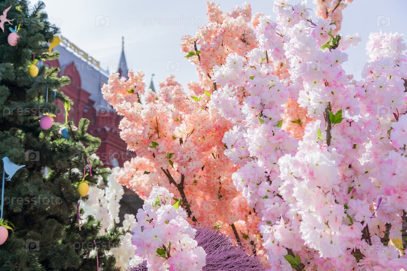 Красочные цветущие искусственные деревья и вишневые деревья на Манежной площади в Москве, Россия. Празднование Пасхи