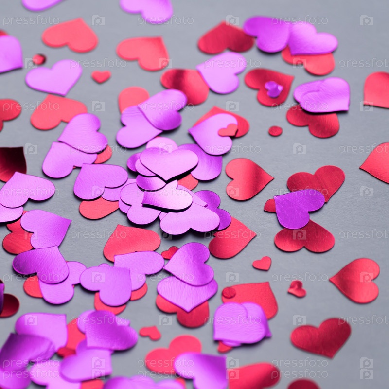 Темный фон с красными и фиолетовыми конфетти сердца на день Святого Валентина. Выборочный фокус. Праздничная и праздничная концепция