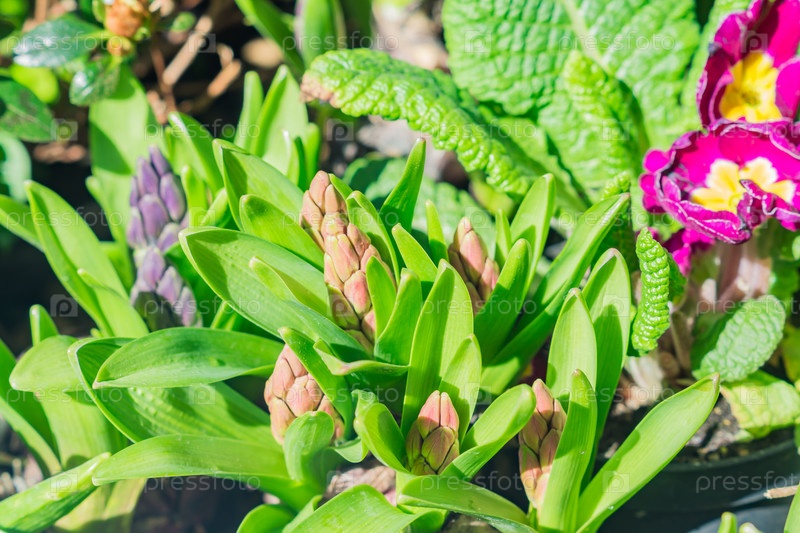Крупный план гиацинтов на клумбе на открытом воздухе