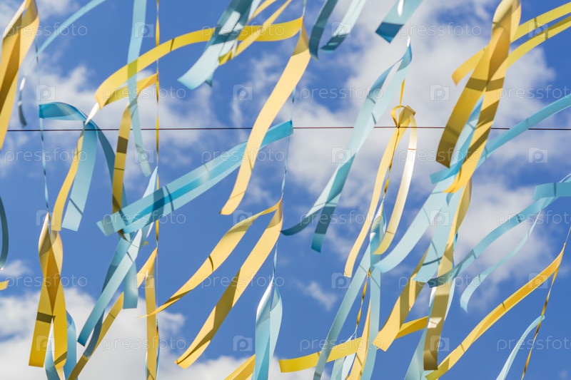Праздничный фон - синие и золотые атласные ленты на фоне голубого неба