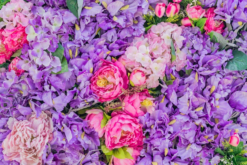 Цветочный фон. Декоративная стена из искусственных цветущих пионов розового и фиолетового цветов
