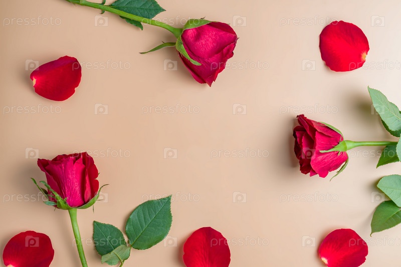 Рамка из красных роз и лепестков цветов на бежевом фоне. Плоская планировка, вид сверху. Рамка из цветов