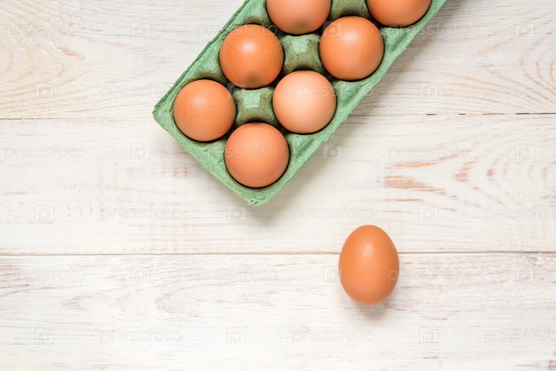 Вид сверху сырых коричневых куриных яиц в картонной коробке для яиц на деревянном столе