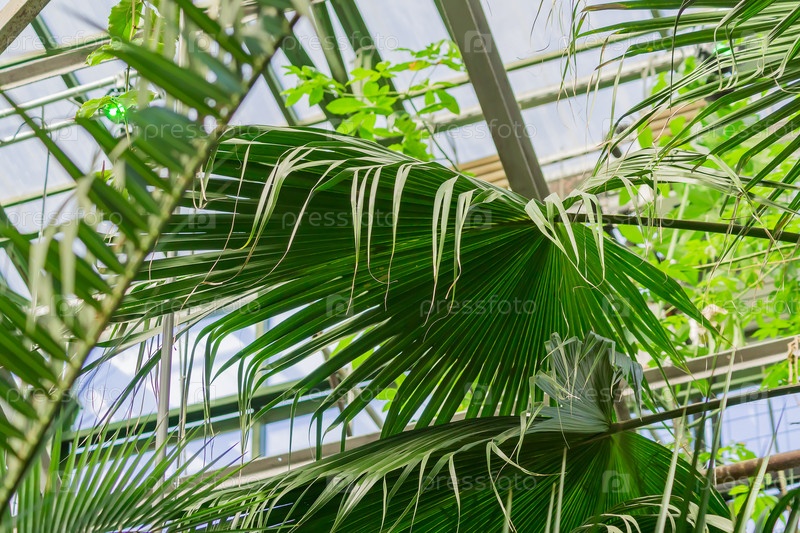 Различные тропические растения в теплице. Пышная листва