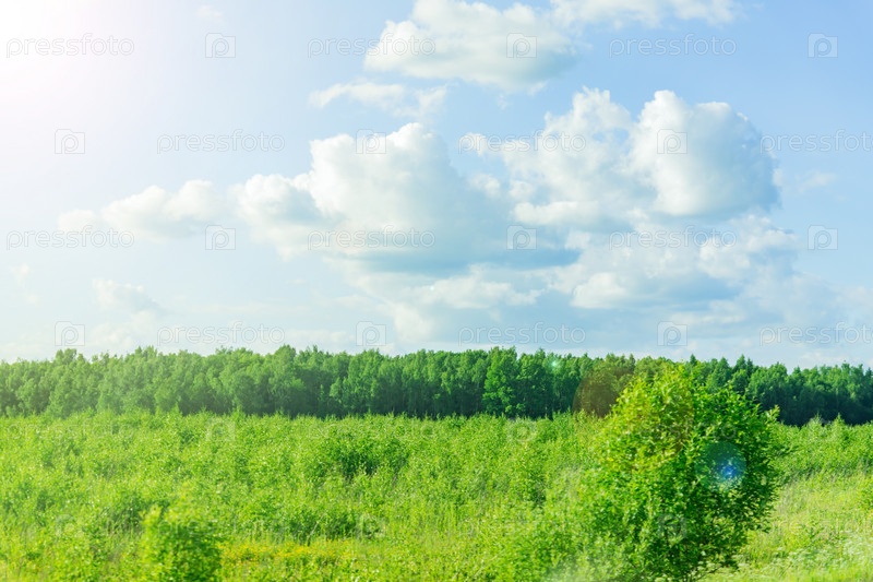 Сельский пейзаж в летний солнечный день. Зеленый лес и красивое небо с облаками