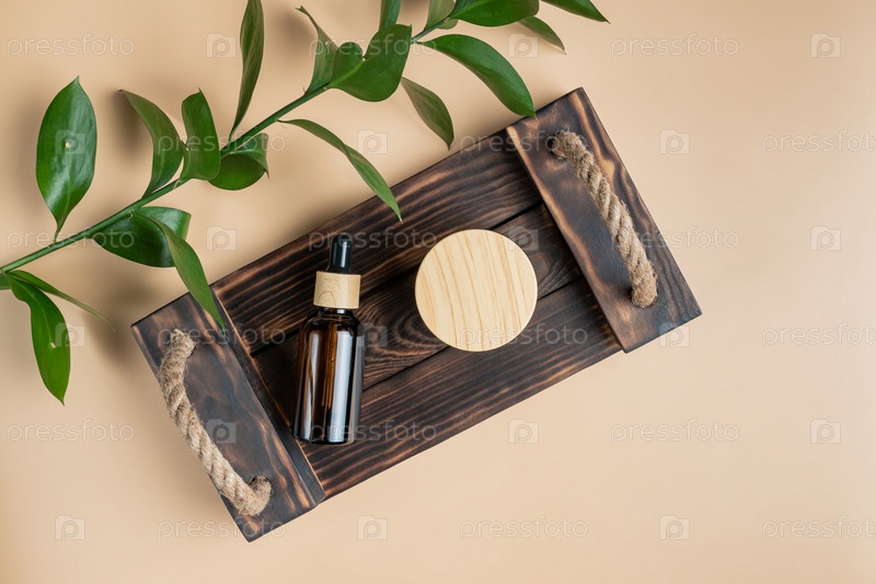 Эфирное масло для лица или сыворотка и кремовая банка с бамбуковой крышкой на деревянном подносе на бежевом фоне. Косметический продукт красоты для концепции ухода за кожей