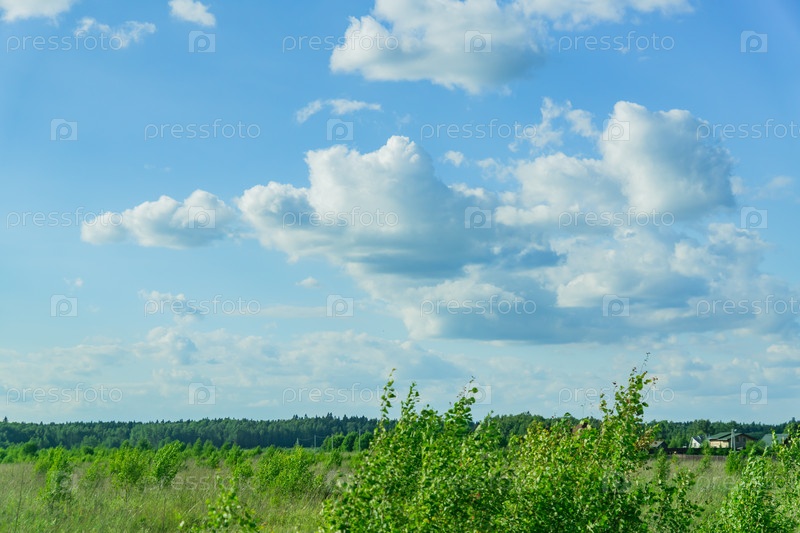 Сельский пейзаж в летний солнечный день. Зеленое поле и красивое небо с облаками