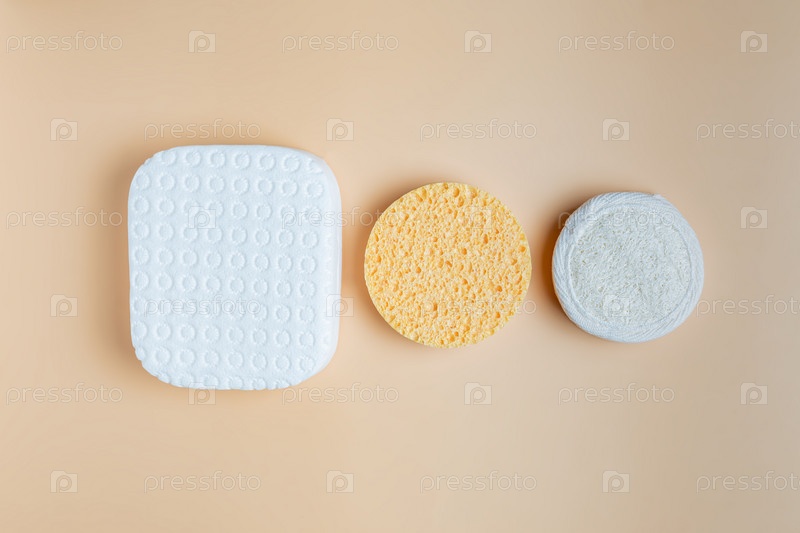 Набор разных губок для лица. Очищающие и отшелушивающие губки на бежевом фоне. Концепция ухода за кожей