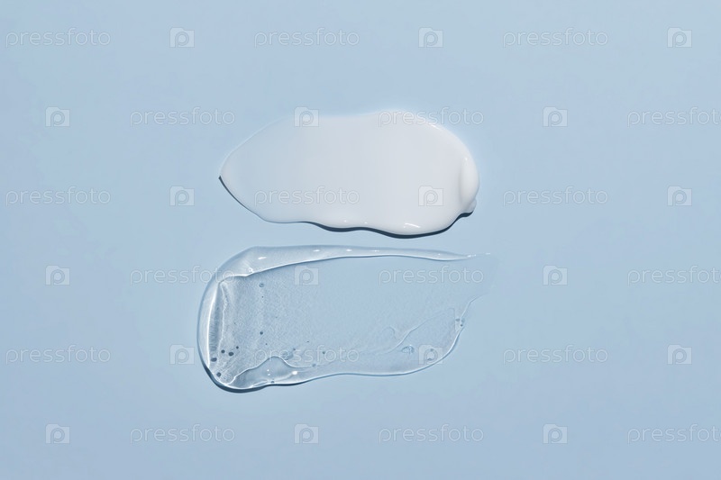 Гель и крем с двойной текстурой, мазок на синем фоне, вид сверху, прозрачная сыворотка с муцином улитки, средство для ухода за кожей, плоский слой, крем с гиалуроновой кислотой