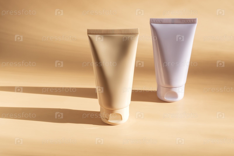Макет двух пластиковых туб для бутылочек для брендинга лекарств или косметики - крема, геля, ухода за кожей, зубной пасты. Контейнеры для косметических бутылок на бежевом фоне. Минимализм