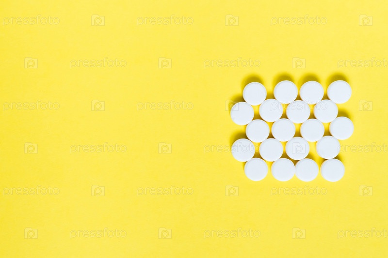 Белые таблетки на желтом фоне. Концепция медицины и здравоохранения